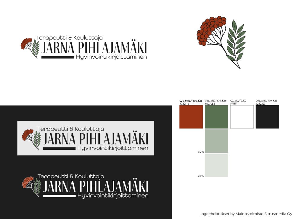 Logon ideointi oli Sitrusmedian käsialaa asiakkaan antamien lähtötietojen pohjalta. Lopputuloksena syntyi tekstilogo, johon kytkettiin yrittäjän sukunimen innoittamana pihlajanoksa. Logo kuvastaa yksinyrittäjän persoonaa ja tuotteliaisuutta sekä se on tunnistettava ja persoonallinen.